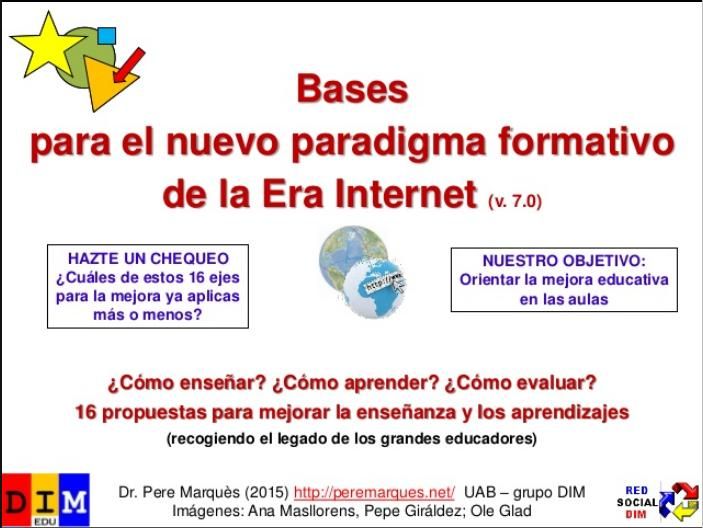 Como en su momento afirmara el sociólogo catalán Manuel Castells «El auge de la tecnología ha puesto al alcance de los estudiantes tal cantidad de información (que aumenta de forma exponencial), que nos vemos obligados a modificar nuestra manera de enseñar». De esta forma y siguiendo la idea de Castells, es necesario asumir sin más demora que, el avance de la Internet rompe el paradigma de la educación basada en la transmisión de conocimientos, para dar paso a una educación enfocada en como sacarle provecho a las casi ilimitadas fuentes de información, herramientas y recursos alojados en «la gran red» de tal forma que seamos capaces de propiciar y lograr aprendizajes significativos en los alumnos de hoy. Con esta idea, y para ayudarnos a enfrentar este nuevo escenario de enseñanza y aprendizaje les compartimos una presentación elaborada por el Dr. Pere Marqués donde se describe 15 propuestas para mejorar los aprendizajes en la era del Internet.