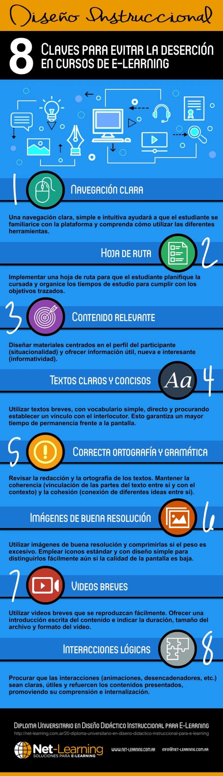 Compartimos una interesante infografía sobre «Diseño Instruccional – 8 Claves para Reducir la Deserción en Cursos de eLearning»