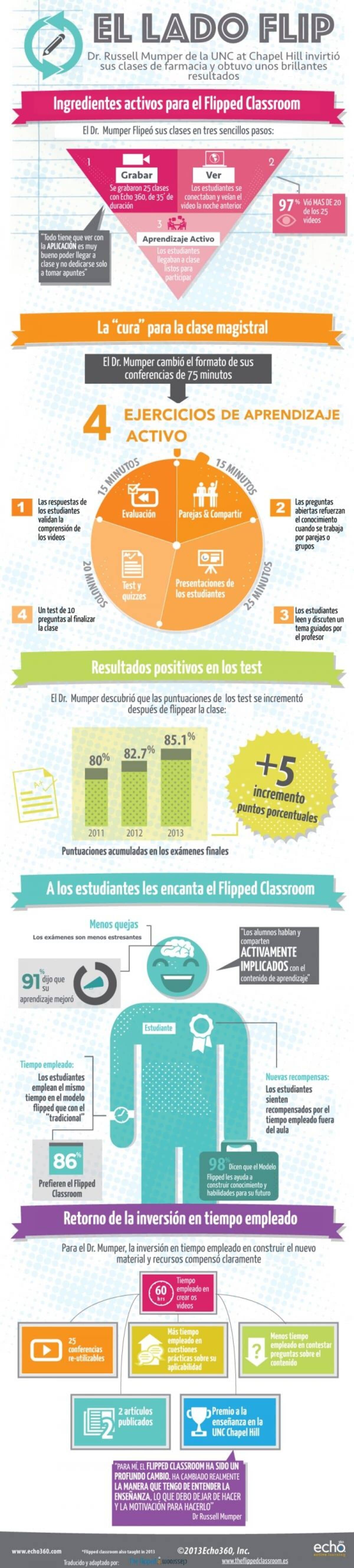 Un número cada vez más creciente de estudios, muestra que los escenarios de aula invertida pueden mejorar el rendimiento de los estudiantes en casi cualquier materia. Según Flipped Learning Network, el 71% de maestros que “voltearon” sus clases notaron mejoras en las calificaciones y, como resultado, el 80% informó que las actitudes de los estudiantes mejoraron. En vista del avance del modelo de aula invertida, la entrada “Aula Invertida en Cifras – La Experiencia del Profesor Russell Mumper” pone al alcance de los maestros una síntesis del estudio realizado por el PhD. Russell Mumper, donde se muestra una mejora significativa en los resultados del aprendizaje después de “voltear” su aula de Farmacia Básica II. La adaptación al español de la infografía fue recuperada de la web educativa theflippedclassroom.