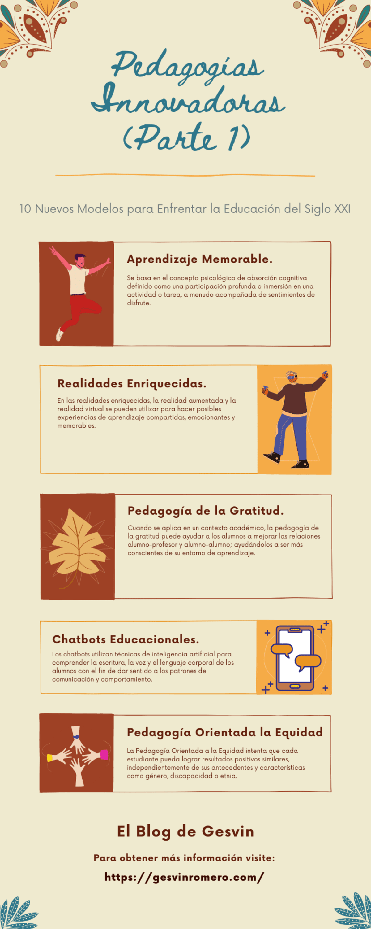 Este listado explora nuevas formas de enseñanza, aprendizaje y evaluación; los cuales están orientados, a un contexto interactivo de manera que sirvan de guía a los docentes, directivos y a los responsables políticos encargados de liderar las iniciativas de innovación educacional. Así entonces, la entrada “Pedagogías Innovadoras – 10 Nuevos Modelos para Enfrentar la Educación del Siglo XXI (Parte I)” describe algunas innovaciones que ya han sido llevadas a la práctica, pero que aún no han tenido una influencia generalizada en la educación. Esta serie de nuevas pedagogías, ha sido elaborada por un grupo de académicos del Instituto de Tecnología Educativa de la Universidad Abierta del Reino Unido, en colaboración con investigadores del Laboratorio de Inteligencia Artificial e Idiomas Humanos del Instituto de Educación en Línea de la Universidad de Estudios Extranjeros de Beijing.