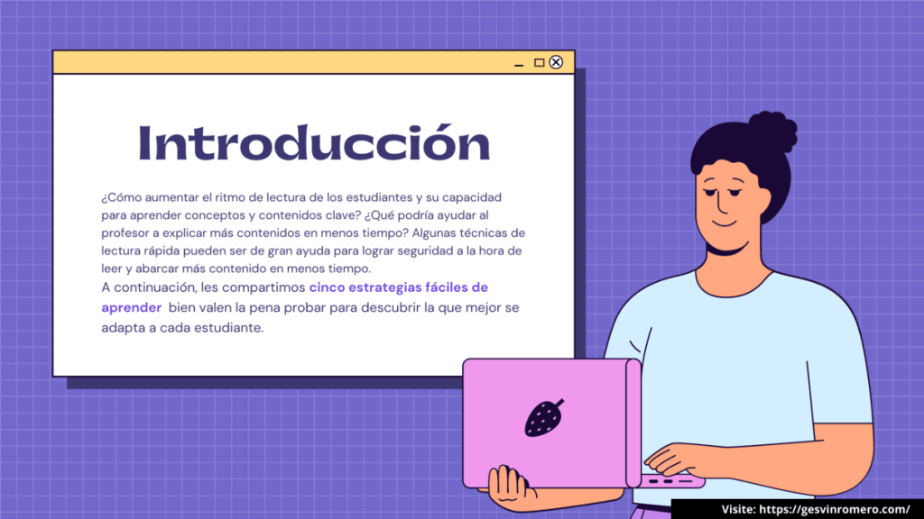 La presentación describe cinco efectivas estrategias de lectura rápida fáciles de aprender que valen la pena probar para descubrir la que mejor se adapte a cada estudiante.