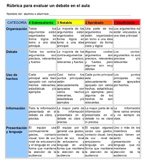Por su parte, la pauta para evaluar el debate como estrategia de aprendizaje puede estar dada por un instrumento de evaluación como por ejemplo una rúbrica analítica, la cual debe presentar los criterios de evaluación de manera clara y con sus respectivos niveles de desempeño. Para ayudarlo con esta tarea le dejamos a continuación un ejemplo de rúbrica para evaluar un debate la cual también puede descargar.