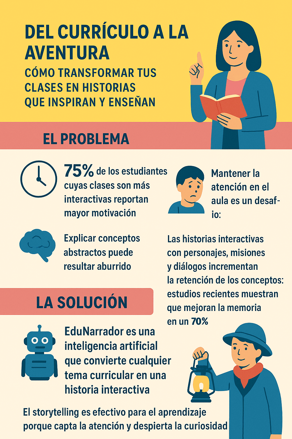 EduNarrador no solo transforma el contenido, sino que lo convierte en una experiencia educativa envolvente, donde los estudiantes asumen roles, toman decisiones y aprenden mientras avanzan en la historia. Cada relato está pensado para enseñar conceptos de manera significativa, despertar la curiosidad y fomentar el pensamiento crítico.