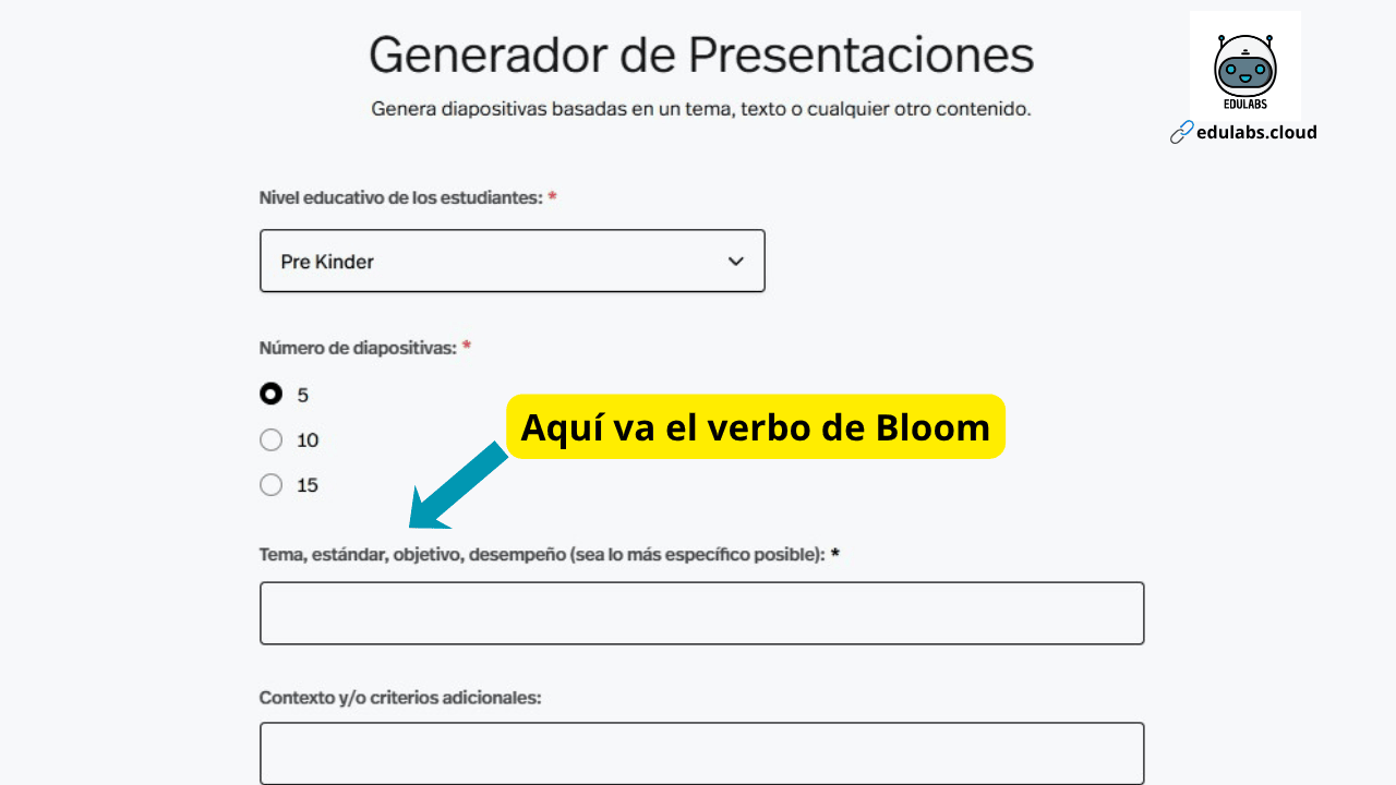 La aplicación Generador de Presentaciones tiene un campo de entrada llamado: «Tema, estándar, objetivo, desempeño» Si este campo es vago, la IA devolverá una presentación genérica. Si es preciso, te dará una herramienta de aprendizaje.