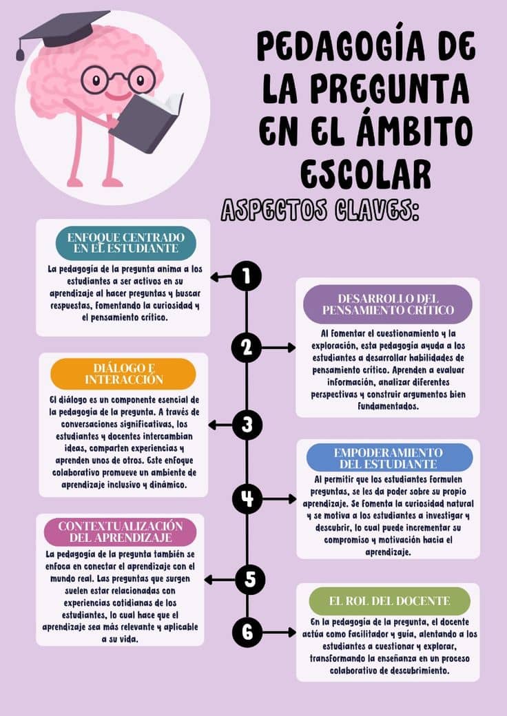 El tema central es la «Pedagogía de la Pregunta en el Ámbito Escolar», un enfoque educativo que transforma el rol del estudiante de receptor pasivo a explorador activo. La imagen detalla seis pilares fundamentales: el enfoque centrado en el estudiante, el desarrollo del pensamiento crítico, el diálogo e interacción, el empoderamiento estudiantil, la contextualización del aprendizaje y la redefinición del rol docente como facilitador. Este modelo busca generar un aprendizaje más profundo, relevante y motivador, donde la curiosidad y la capacidad de cuestionar son las herramientas principales para la construcción activa del conocimiento.