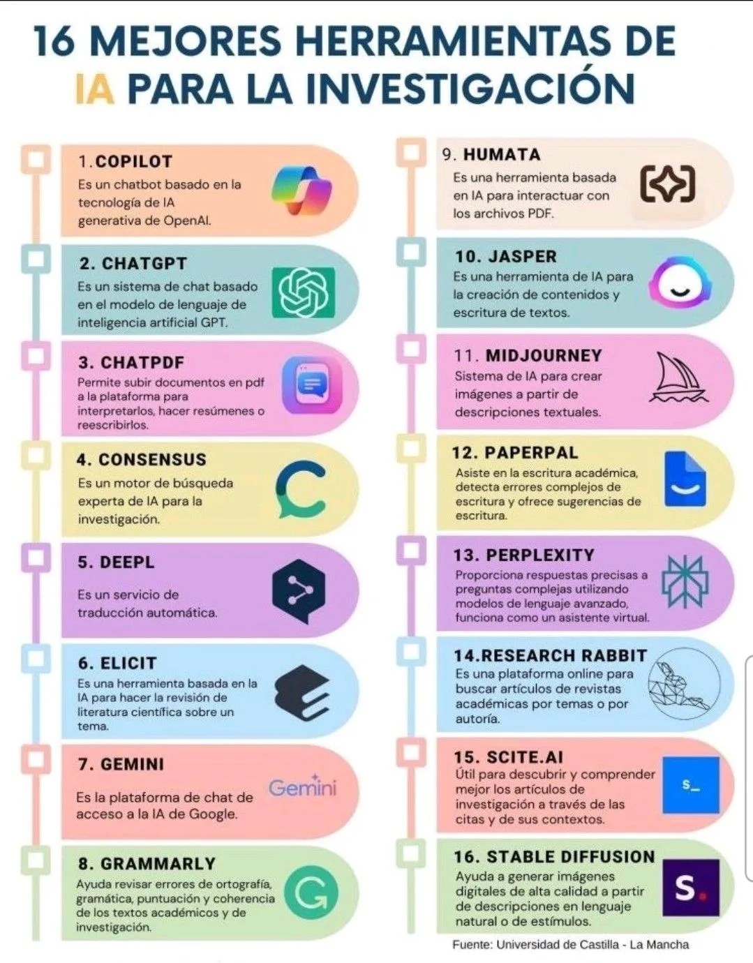 ¡Hola amigos! hoy compartimos un interesante contenido sobre «16 Herramientas de IA Imprescindibles para Potenciar tu Investigación Académica | Infografía»