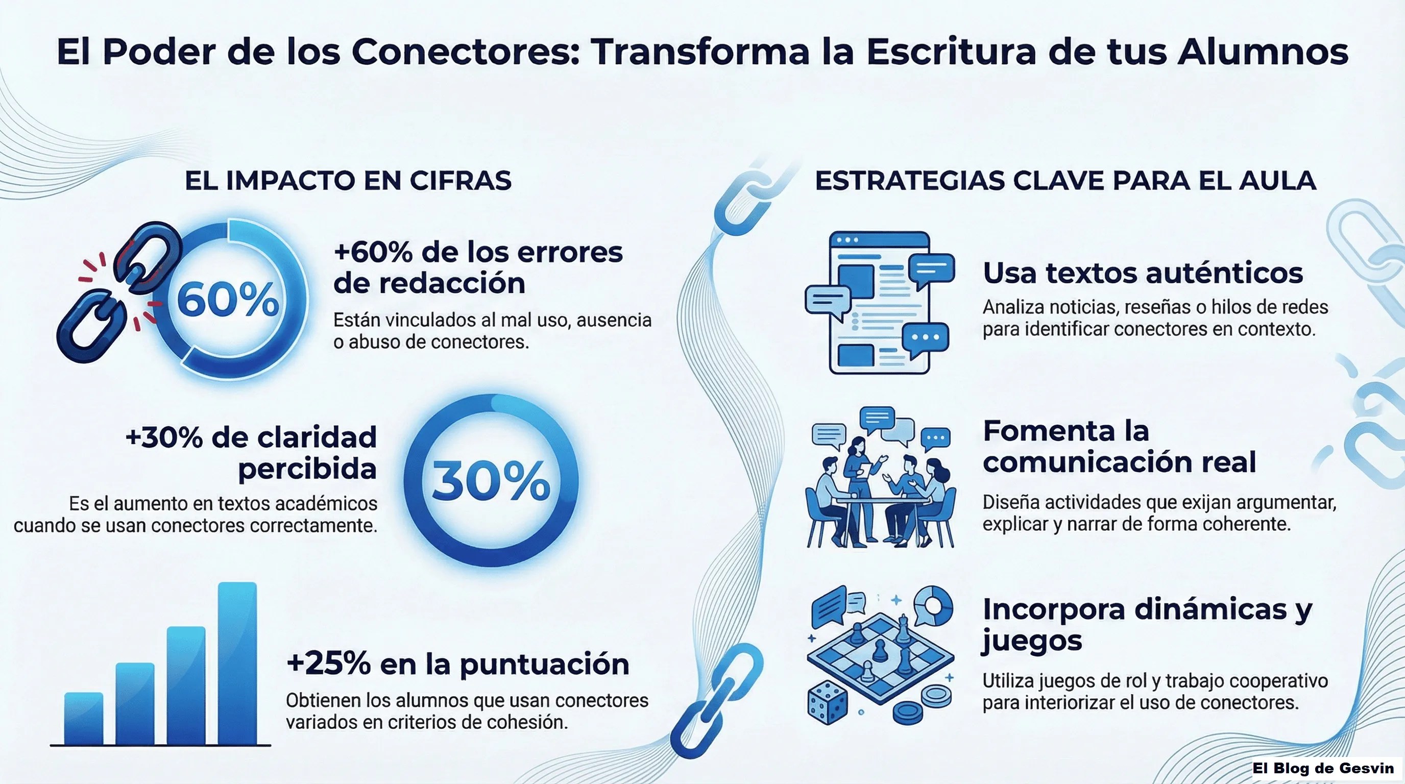 La infografá «El Poder de los Conectores – Transforma la Escritura de tus Alumnos» presenta una guía invaluable que redefinirá la enseñanza de estos elementos esenciales en la comunicación escrita. Al enfatizar la importancia de contextualizar el aprendizaje de conectores en situaciones de la vida real y en textos auténticos, el autor promueve un enfoque práctico que va más allá de la memorización. Este recurso es esencial para educadores que desean mejorar la calidad de la escritura de sus alumnos de manera efectiva y significativa.