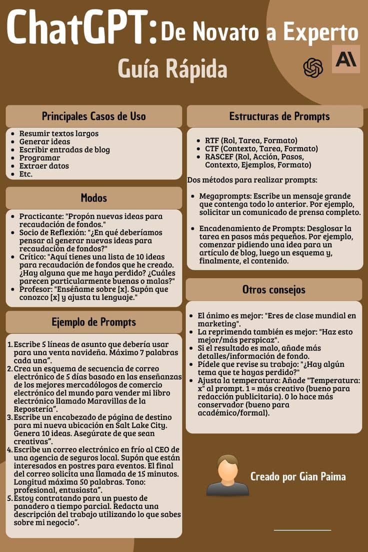 Esta guía visual es extremadamente valiosa por su enfoque estructurado y práctico. No solo enumera los usos básicos de ChatGPT, sino que profundiza en metodologías avanzadas como el encadenamiento y las estructuras de prompts (RASCEF). Es un recurso esencial para cualquier usuario que busque optimizar su interacción con la IA, ofreciendo ejemplos concretos que demuestran la teoría. Muestra cómo refinar la interacción para obtener resultados específicos.