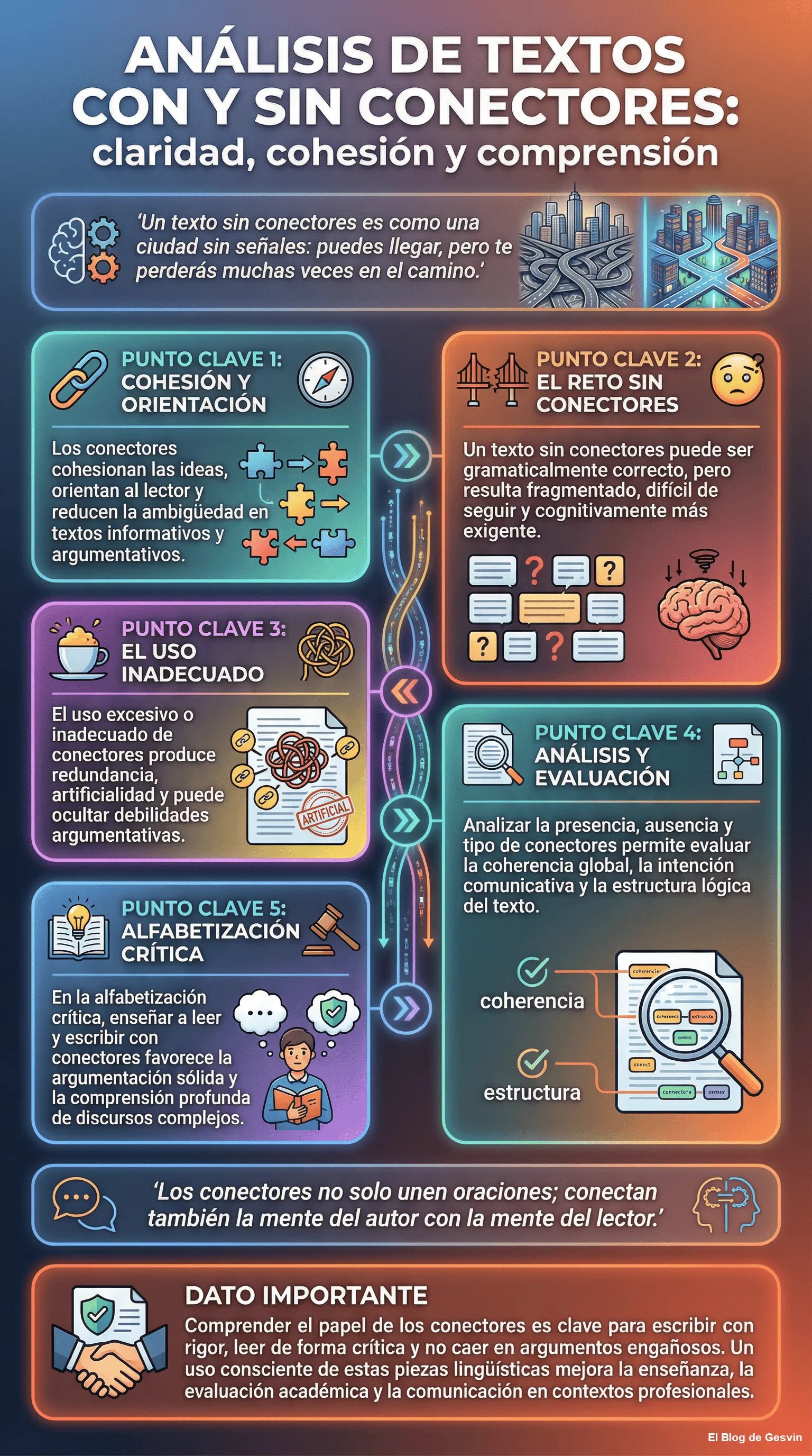 La infografía «Análisis de textos con y sin conectores: claridad, cohesión y comprensión» profundiza en la importancia de los conectores en la estructura de los textos. Su uso adecuado no solo mejora la cohesión y la claridad, sino que también facilita la comprensión para el lector, especialmente para aquellos en formación. Este análisis es esencial para educadores y estudiantes que buscan fortalecer sus habilidades de escritura y lectura crítica, resaltando cómo los detalles en la redacción pueden hacer una gran diferencia en la efectividad comunicativa.