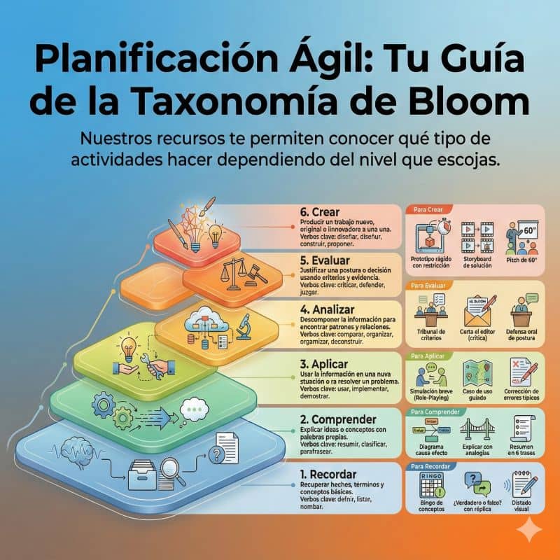- Estructura clara de 6 niveles cognitivos progresivos: desde la base del conocimiento (Recordar) hasta la cúspide de la innovación (Crear).
