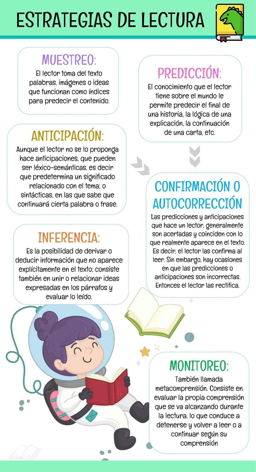 La imagen aborda las seis estrategias de lectura fundamentales que un lector experto utiliza de manera consciente o inconsciente para construir significado y asegurar la comprensión. Estas incluyen el Muestreo, la Predicción, la Anticipación, la Inferencia, la Confirmación o Autocorrección, y el Monitoreo (Metacomprensión). El diseño es altamente didáctico y visualmente atractivo, utilizando la metáfora de un astronauta leyendo para enfatizar que la lectura es un proceso de exploración y descubrimiento cognitivo. Se destacan las definiciones claras y concisas de cada proceso mental que interviene en la comprensión activa de un texto.
