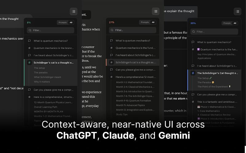 - Índice Clicable Automático: Genera instantáneamente un índice de los puntos clave de conversaciones extensas con IA, permitiendo la navegación directa a secciones específicas.