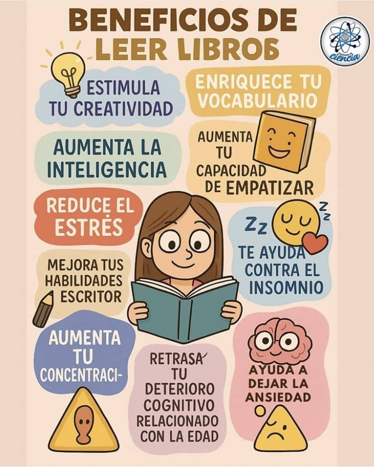 La imagen aborda el tema de los múltiples beneficios que aporta la práctica de la lectura de libros. Destaca que leer no solo es un placer intelectual, sino una herramienta poderosa para el bienestar físico y mental. Los aspectos más destacados incluyen la mejora de funciones cognitivas (como la creatividad, la inteligencia y la concentración), el enriquecimiento lingüístico (vocabulario y habilidades de escritura), y el impacto positivo en la salud emocional (reducción de estrés, ansiedad e insomnio, y aumento de la empatía). La lectura se posiciona como una práctica esencial para el desarrollo personal a lo largo de toda la vida, incluso para retrasar el deterioro cognitivo.