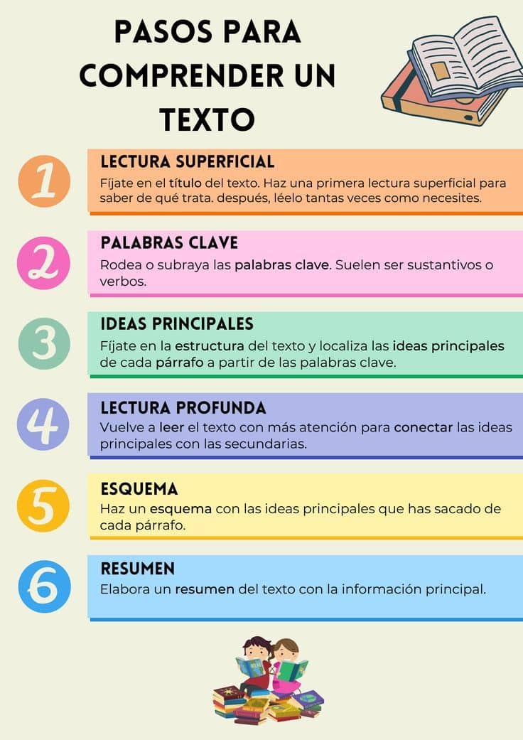 La imagen presenta una guía secuencial y estructurada de seis pasos esenciales para lograr la comprensión efectiva de cualquier texto. El tema central es la mejora de las habilidades de lectura y estudio mediante un proceso que evoluciona desde la familiarización inicial (lectura superficial) hasta la síntesis y la retención profunda (esquema y resumen). Destaca la importancia de la lectura activa, la identificación de elementos clave (palabras clave, ideas principales) y el uso de herramientas de organización visual para cimentar el conocimiento, ofreciendo un método claro y reproducible para estudiantes de todos los niveles.