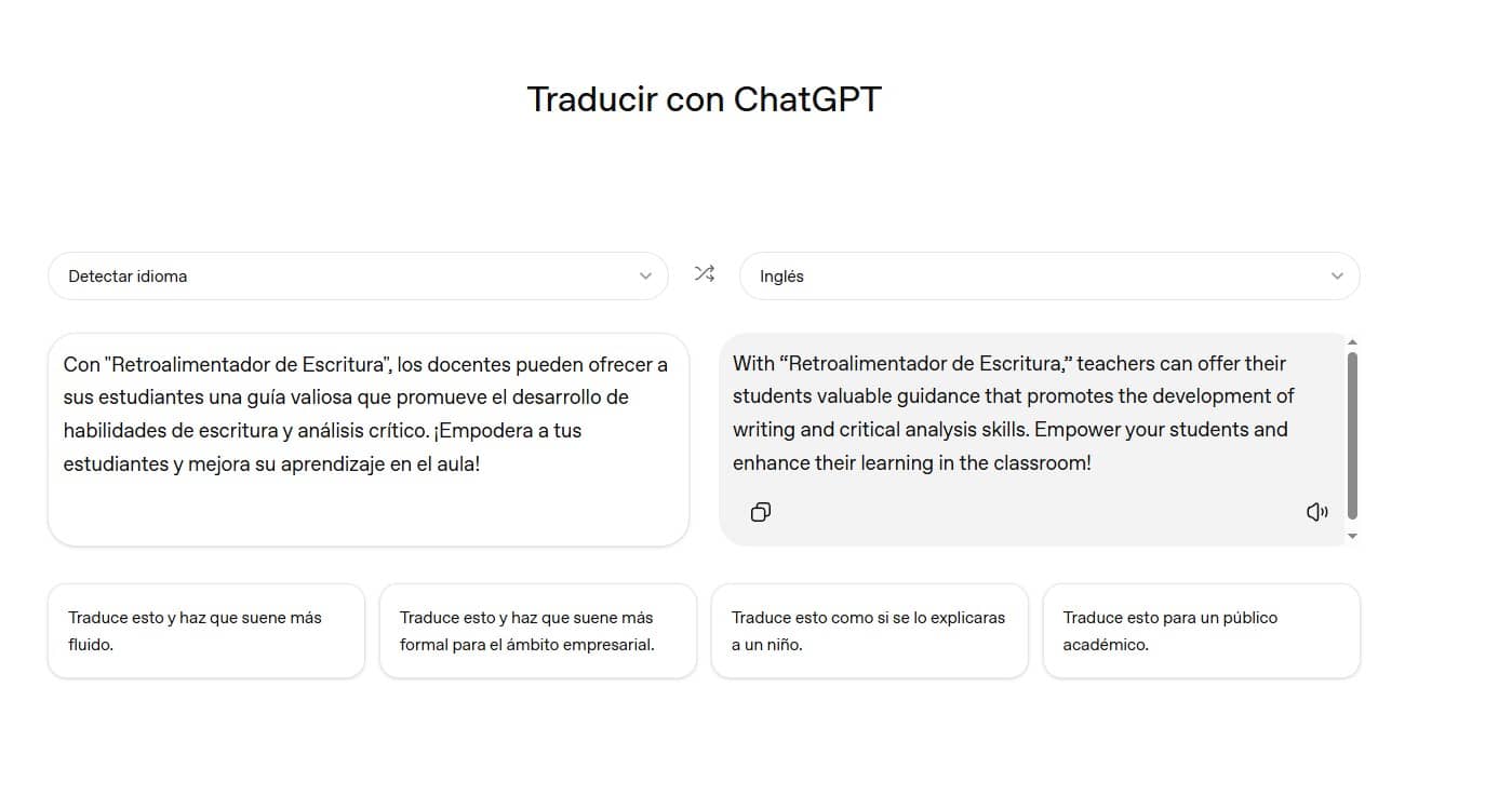 El potencial de ChatGPT Translate en el sector docente es transformador, especialmente en aulas con diversidad lingüística o en la enseñanza de idiomas extranjeros. Al ofrecer traducciones que se adaptan al contexto, los docentes pueden generar materiales didácticos bilingües de alta calidad o adaptar recursos internacionales con mayor fidelidad. Además, su función como «herramienta de edición y adaptación lingüística» permite a los estudiantes practicar la traducción de una manera más profunda, entendiendo no solo el significado literal sino también las implicaciones culturales y contextuales, promoviendo así una comprensión más auténtica del idioma.