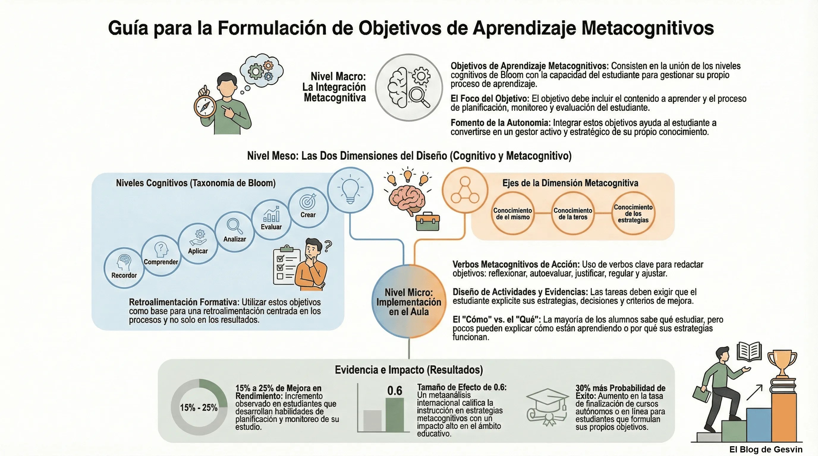 Esta «Guía para la Formulación de Objetivos de Aprendizaje Metacognitivos» ofrece una ruta estratégica para transformar la enseñanza mediante la integración de la metacognición con los niveles tradicionales de la Taxonomía Revisada de Bloom. La guía propone que los docentes no solo se enfoquen en el contenido, sino que diseñen objetivos que obliguen al estudiante a planificar, monitorear y evaluar su propio proceso intelectual. Al enfatizar el uso de verbos que fomenten la autorregulación y la autonomía, se destaca que entender el «cómo» se aprende puede elevar el rendimiento académico hasta en un 25 %. El propósito es convertir al alumno en un gestor activo de su conocimiento, proporcionando herramientas prácticas para mejorar la perseverancia y el éxito en entornos de aprendizaje independientes.