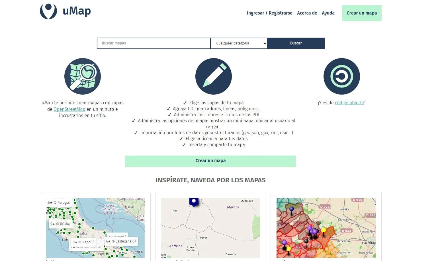 uMap es una aplicación web gratuita y de código abierto que permite a cualquier usuario crear mapas personalizados con gran facilidad, utilizando como base las capas de OpenStreetMap. La herramienta se distingue por su simplicidad, permitiendo añadir marcadores, líneas, polígonos y puntos de interés (PDI) con información multimedia, y posteriormente incrustar el mapa interactivo resultante en cualquier sitio web o blog educativo. Es una alternativa robusta y flexible a otras soluciones de mapeo, ideal para proyectos que requieren geolocalización de datos sin restricciones de uso comercial o licencias costosas.