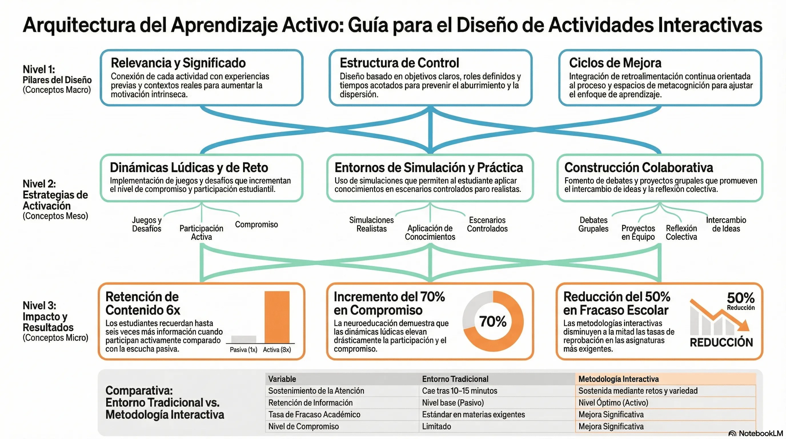 Este documento visual ofrece una guía estratégica para transformar la enseñanza tradicional mediante el aprendizaje activo, destacando que la participación directa permite a los estudiantes retener información con una eficacia seis veces mayor. El texto propone estructurar las lecciones a través de metodologías interactivas y lúdicas que vinculen el contenido con la realidad del alumno, lo cual puede reducir el fracaso académico hasta en un 50%. Para lograrlo, enfatiza la necesidad de establecer objetivos claros y retroalimentación constante, asegurando que el dinamismo de la clase mantenga el compromiso estudiantil frente a la brevedad de los periodos de atención natural. En última instancia, el propósito es fomentar la metacognición y la motivación intrínseca, convirtiendo al estudiante en un protagonista consciente de su propio proceso educativo.