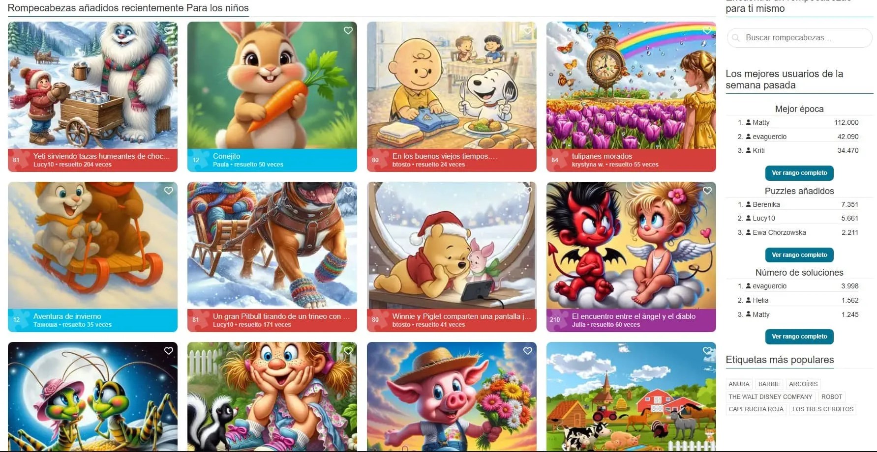 - Amplio catálogo de puzles preexistentes, clasificados por categorías temáticas (arte, ciencia, geografía, etc.).