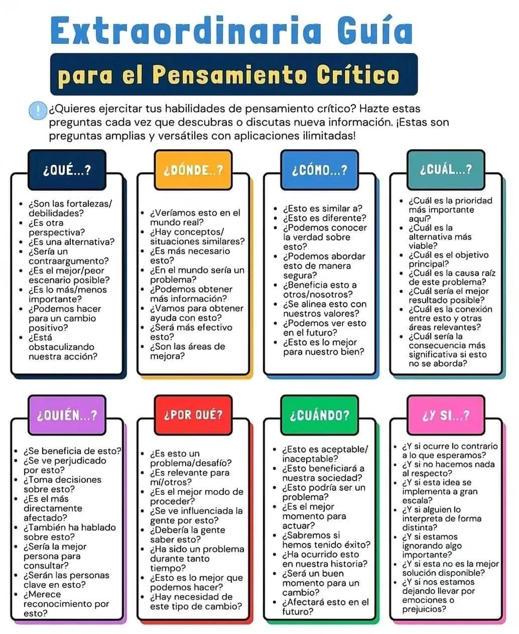 El visual aborda una «Guía Extraordinaria para el Pensamiento Crítico», estructurada en ocho categorías de preguntas esenciales (Qué, Dónde, Cómo, Cuál, Quién, Por Qué, Cuándo, Y Si). Esta herramienta visual es excepcionalmente útil para guiar el análisis profundo de cualquier información, problema o situación. Su principal aspecto destacado es la exhaustividad y la versatilidad, proporcionando un marco sistemático para ir más allá de la superficie y ejercitar las habilidades analíticas de manera práctica y efectiva.