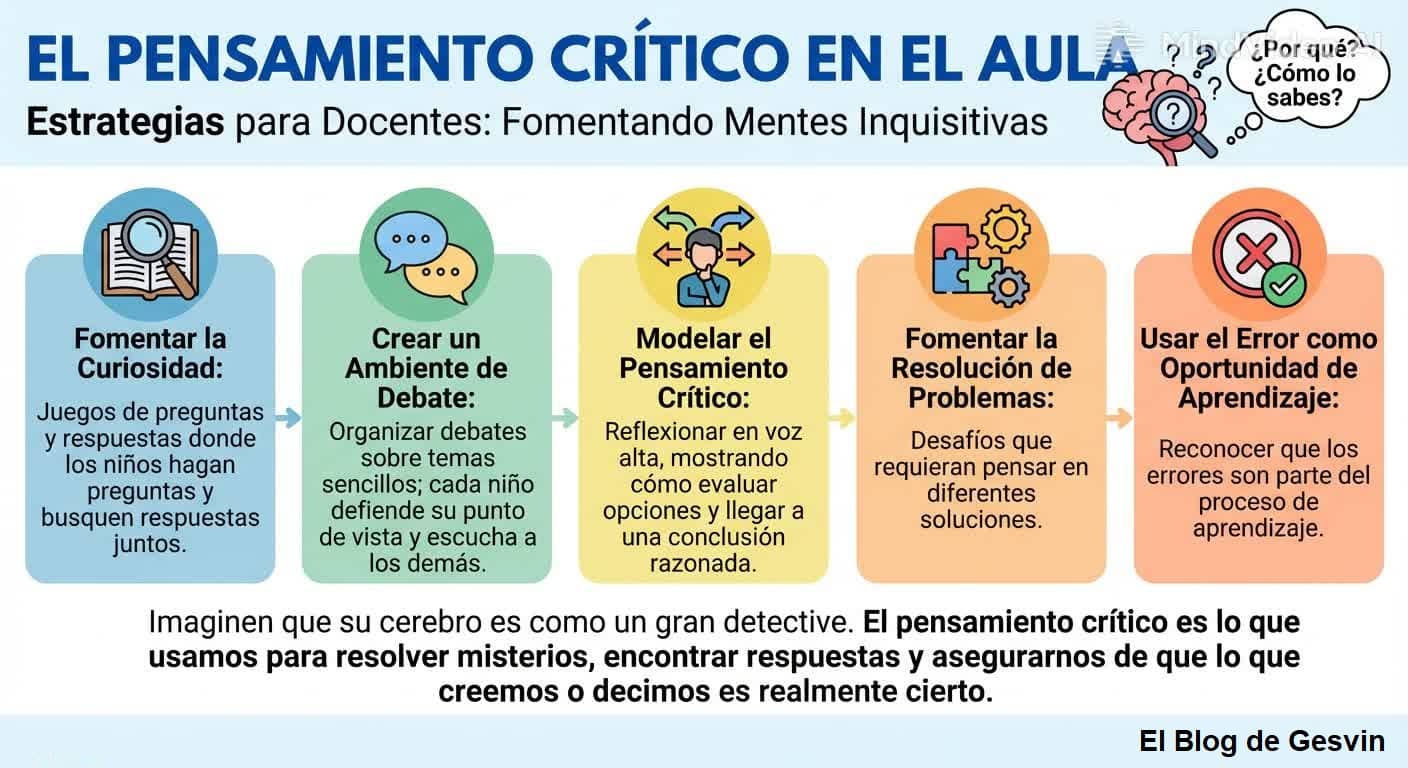 La imagen aborda el tema fundamental del desarrollo del Pensamiento Crítico (PC) en el aula, ofreciendo cinco estrategias clave dirigidas a docentes para fomentar mentes inquisitivas. Los aspectos más destacados incluyen la promoción de la curiosidad y el debate como pilares iniciales, el modelado explícito del proceso de razonamiento por parte del profesor, y la revalorización del error como una valiosa oportunidad de aprendizaje. Se presenta el PC como una habilidad de ‘gran detective’ esencial para resolver misterios y validar la información.