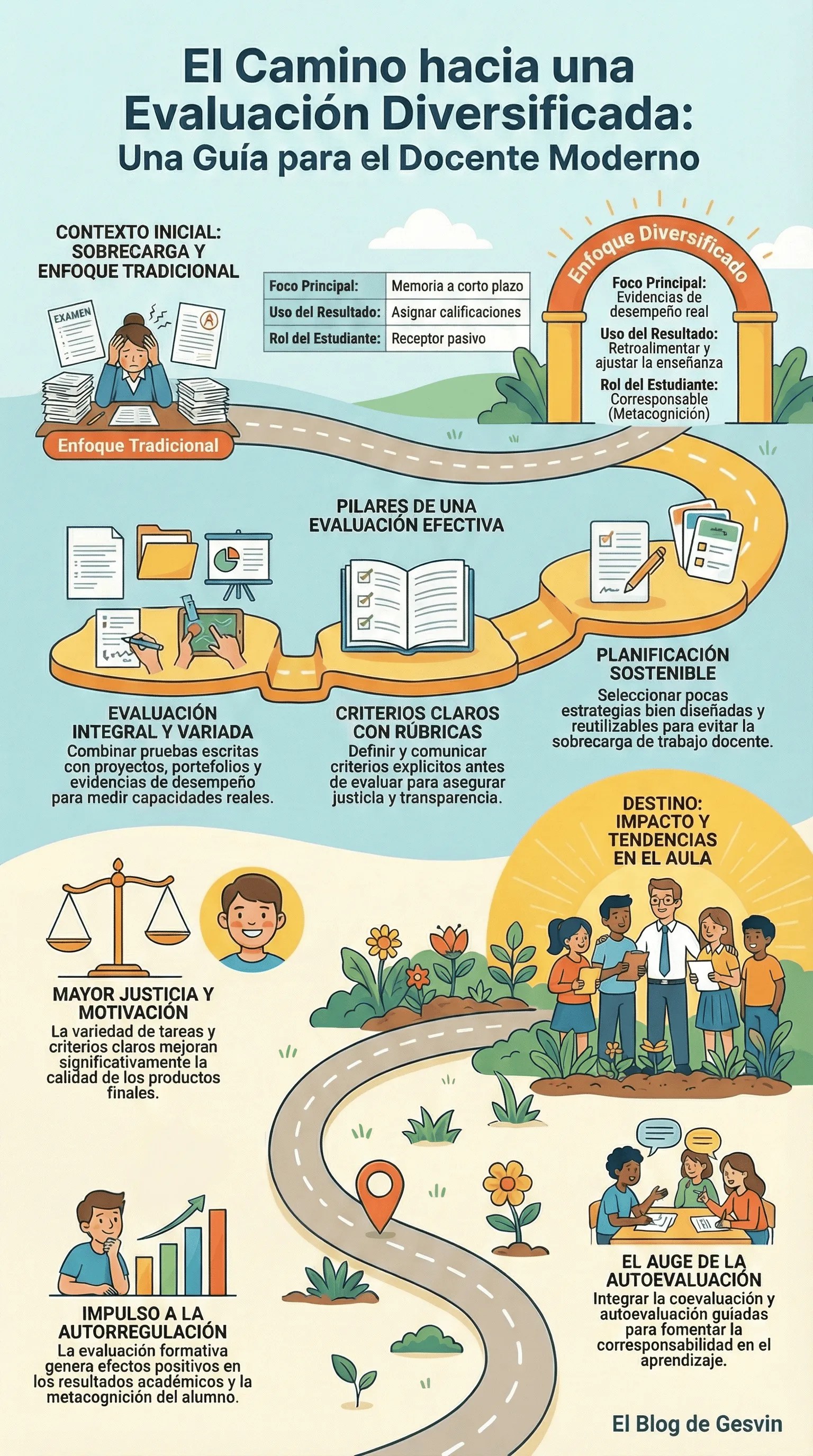 Esta infografía presenta una guía para transformar la práctica docente mediante la implementación de múltiples métodos de valoración que superan el examen escrito tradicional. La propuesta central radica en diversificar las evidencias de aprendizaje a través de proyectos, portafolios y autoevaluaciones, asegurando que el proceso sea justo, pedagógicamente sólido y sostenible para el profesor. Al integrar criterios de evaluación transparentes y rúbricas claras, el texto busca que la calificación no sea un fin en sí mismo, sino una herramienta para retroalimentar el crecimiento académico y fomentar la autonomía del estudiante. En última instancia, la obra destaca que variar las formas de evaluar mejora la calidad de los resultados educativos y fortalece la motivación dentro del aula.