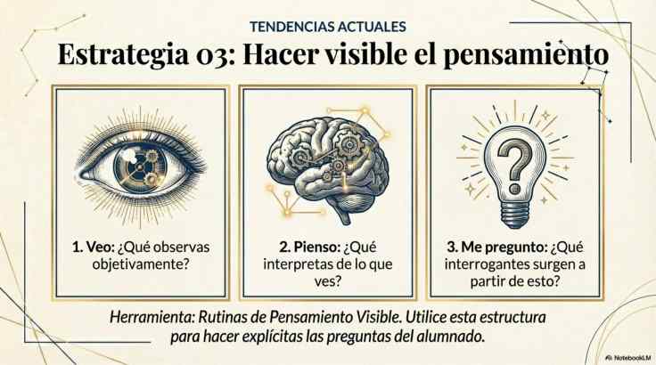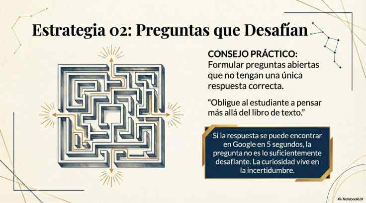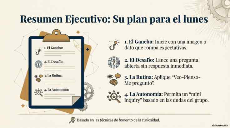 Esta ayuda visual ofrece una guía estratégica para transformar el aula en un espacio de indagación activa, donde el docente diseña experiencias que despiertan un deseo genuino por aprender. El texto destaca que estimular la curiosidad no solo mejora el rendimiento académico, sino que activa los sistemas de recompensa cerebrales, facilitando una comprensión profunda y una mayor persistencia en el estudio. Mediante el uso de preguntas abiertas y rutinas de pensamiento visible, la fuente propone conectar los contenidos teóricos con dilemas del mundo real para que el estudiante se convierta en el protagonista de su propio proceso de descubrimiento. El propósito es brindar herramientas prácticas y fundamentadas que conviertan el aprendizaje en un reto motivador y significativo.