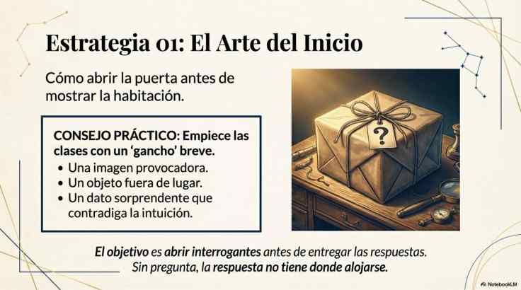 - Ganchos potentes y breves: Pequeños detonantes al inicio de la clase que despiertan el “quiero saber más” sin ocupar medio periodo.