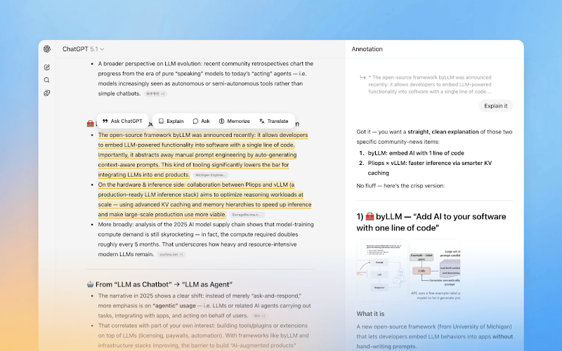 HighlightGPT es una extensión de navegador (Chrome) que potencia la interacción con ChatGPT al permitir a los usuarios seleccionar cualquier fragmento de texto, ya sea dentro de ChatGPT o en cualquier página web, para generar acciones inmediatas asistidas por IA. Elimina la necesidad de copiar y pegar, facilitando tareas como solicitar explicaciones, traducciones, resúmenes o formular preguntas rápidas, todo a través de un panel lateral contextualizado.