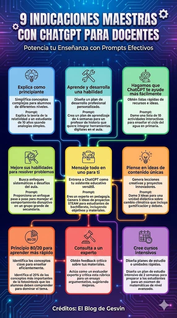 La imagen aborda la integración estratégica de la Inteligencia Artificial, específicamente ChatGPT, como un asistente pedagógico fundamental para los docentes. El tema central son las ‘9 Indicaciones Maestras’ o categorías de prompts efectivos diseñados para maximizar la utilidad de la herramienta en diversas tareas educativas. Los aspectos más destacados incluyen la capacidad de simplificar contenido complejo (‘Explica como principiante’), diseñar desarrollo profesional personalizado (‘Aprende y desarrolla una habilidad’), generar material didáctico innovador (proyectos STEAM, unidades con gamificación) y actuar como un experto evaluador, aplicando principios como el 80/20 para optimizar el proceso de enseñanza-aprendizaje.