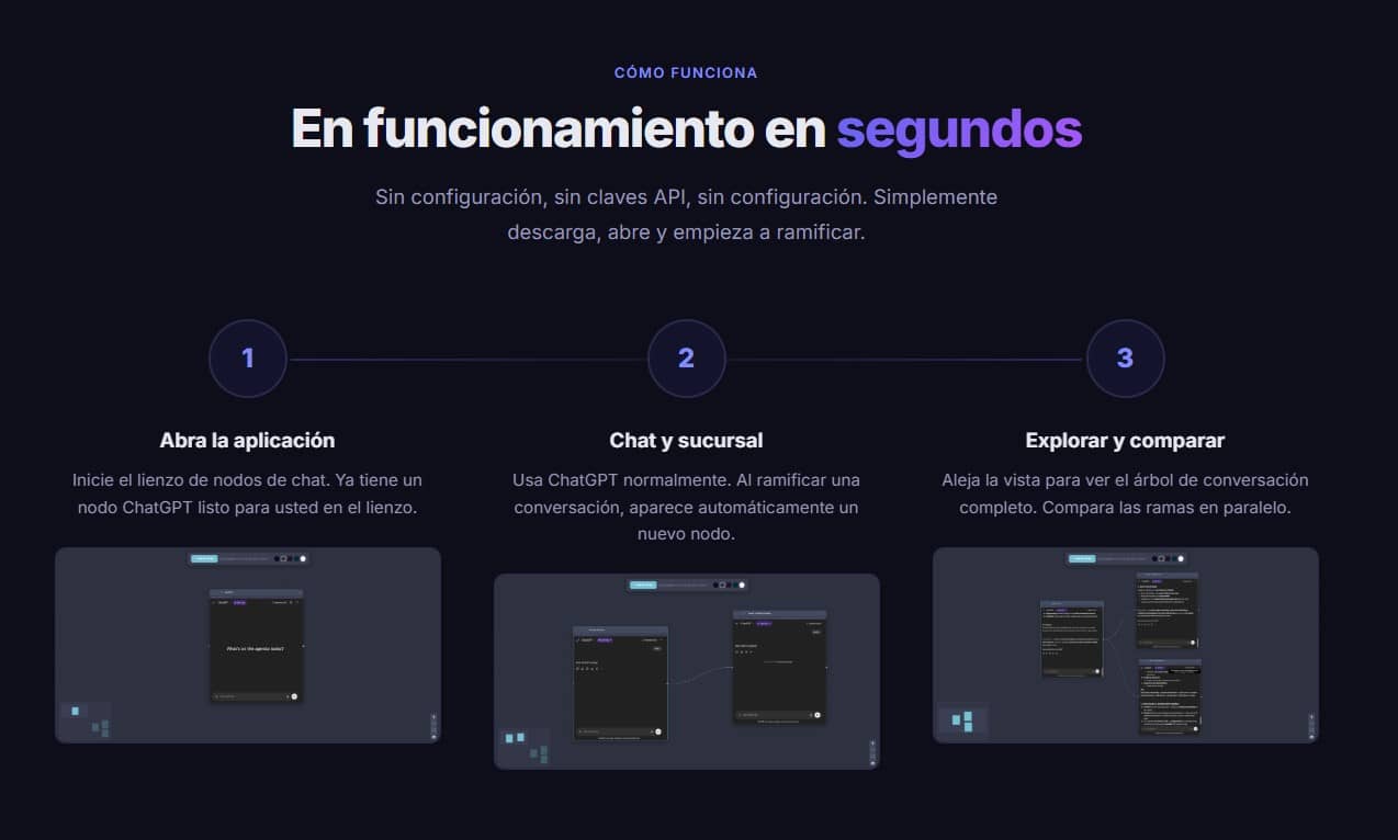 Chat Nodes Canvas es una herramienta que permite a los usuarios de ChatGPT (o clientes de IA similares con lienzo infinito como Flowith) visualizar y ramificar sus conversaciones de chat en un entorno de trabajo expansivo y no lineal. Esta característica transforma la interacción secuencial tradicional con la IA en un mapa mental o diagrama de flujo visual, donde se pueden explorar, desarrollar y comparar múltiples líneas de pensamiento o respuestas generadas por el modelo sin sobrescribir o perder el hilo conductor original.