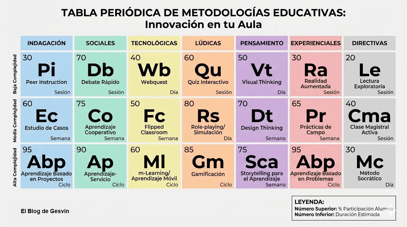 ¡La innovación llega al aula con una tabla periódica! 🧪 Descubre 21 metodologías clasificadas por complejidad y participación estudiantil (de 20% a 95%). ¿Cuál usas hoy? 🤔 #MetodologíasActivas #InnovaciónEducativa
