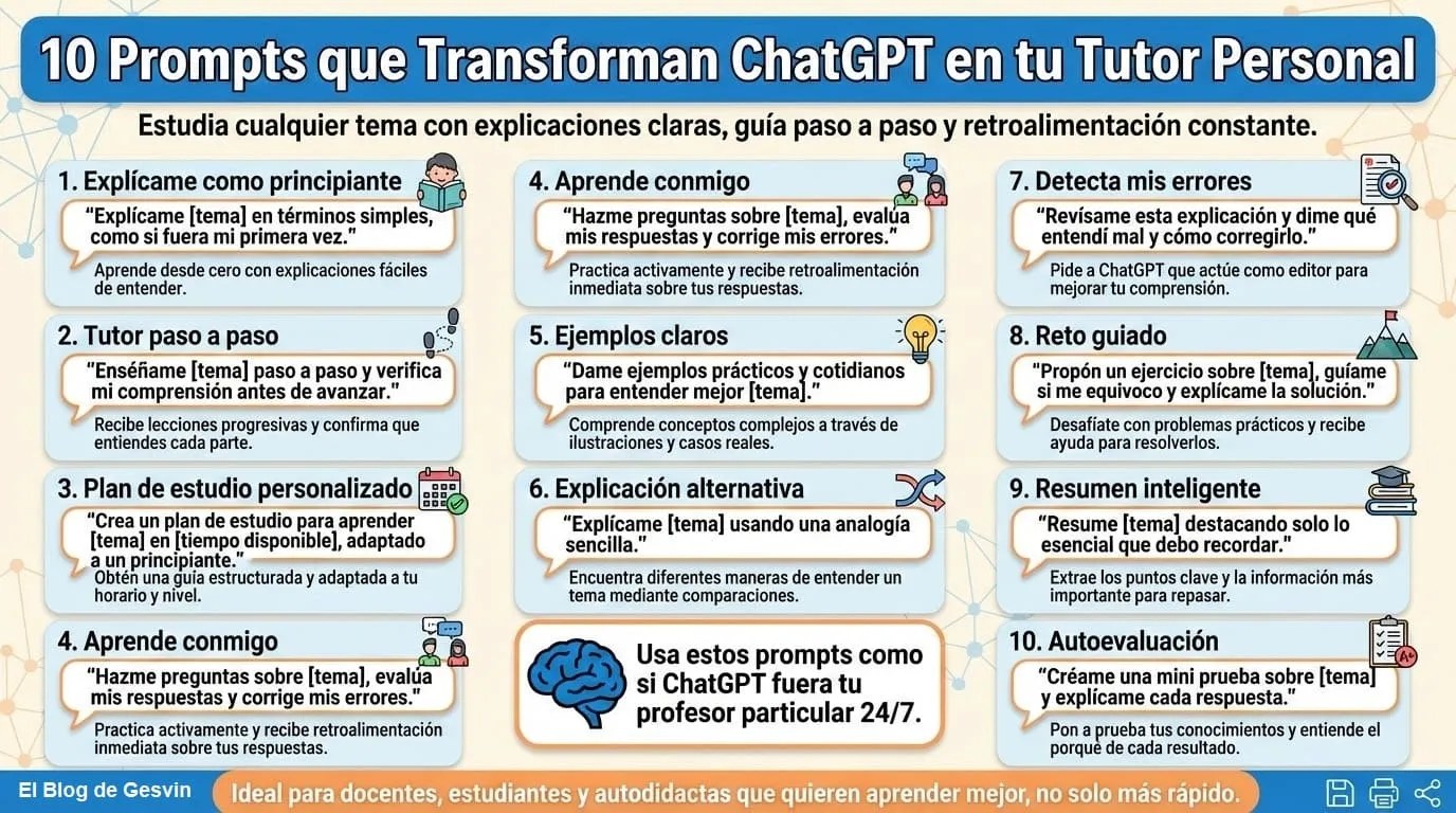 Este visual presenta una excelente taxonomía de prompts diseñados para maximizar el potencial pedagógico de ChatGPT, transformándolo de una simple herramienta de consulta a un verdadero agente de aprendizaje personalizado. Este enfoque didáctico es crucial porque supera la interacción superficial, guiando al usuario a través de un ciclo completo de enseñanza-aprendizaje.