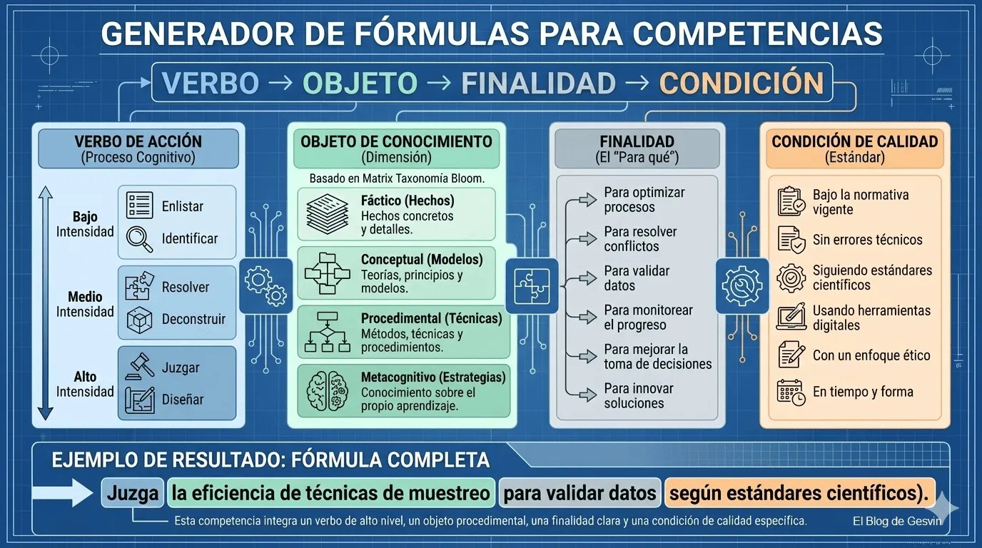 Este «Generador de Fórmulas para Competencias» es una herramienta didáctica excepcional que aborda uno de los desafíos centrales en la Educación Basada en Competencias (EBC): la redacción precisa y medible de los resultados de aprendizaje esperados. Su valor reside en la segmentación clara de los cuatro componentes esenciales de una competencia bien formulada: Verbo de Acción, Objeto de Conocimiento, Finalidad y Condición de Calidad.