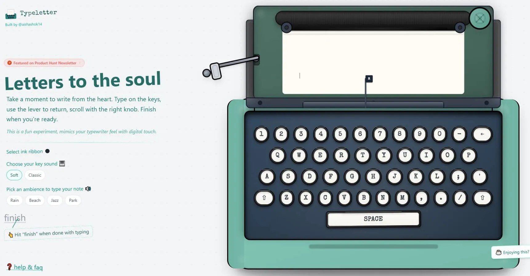 Typeletter es un simulador de máquina de escribir vintage gratuito y accesible desde el navegador, diseñado para ofrecer una experiencia de escritura intencional y libre de distracciones. Imita el proceso de tecleo tradicional con sonidos realistas de las teclas y el carro de retorno, y permite personalizar la experiencia con diferentes colores de tinta (negro, rojo, azul, sepia) y sonidos ambientales. Su funcionalidad principal es proporcionar un entorno minimalista para redactar notas, diarios o cartas, con la opción de guardar, enviar por correo o compartir el resultado final como una «imagen» con estética retro.