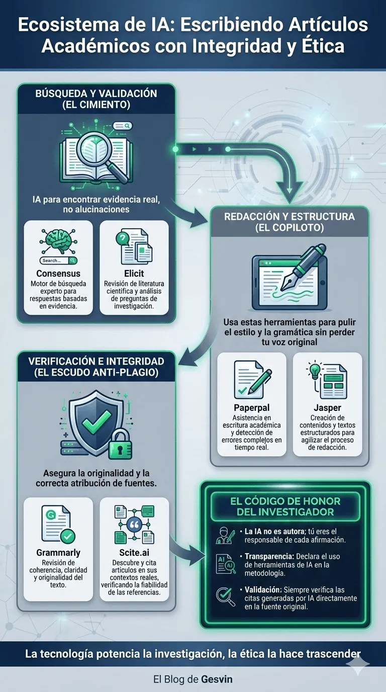 Esta infografía presenta un ecosistema completo para la elaboración de artículos académicos utilizando inteligencia artificial de manera ética y responsable. El diagrama se estructura en tres fases fundamentales: Búsqueda y Validación (el cimiento), Redacción y Estructura (el copiloto), y Verificación e Integridad (el escudo anti-plagio).