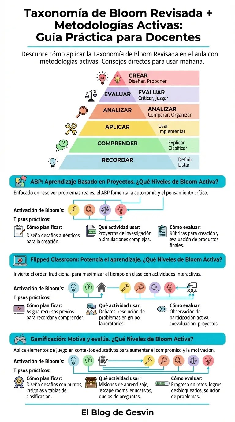 Esta infografía presenta una guía completa que integra la Taxonomía de Bloom Revisada con tres metodologías activas fundamentales. La pirámide muestra los seis niveles cognitivos desde Recordar hasta Crear, cada uno con sus verbos asociados. Lo destacable es cómo cada metodología activa (Aprendizaje Basado en Proyectos, Flipped Classroom y Gamificación) se mapea específicamente contra los niveles de Bloom que activa.