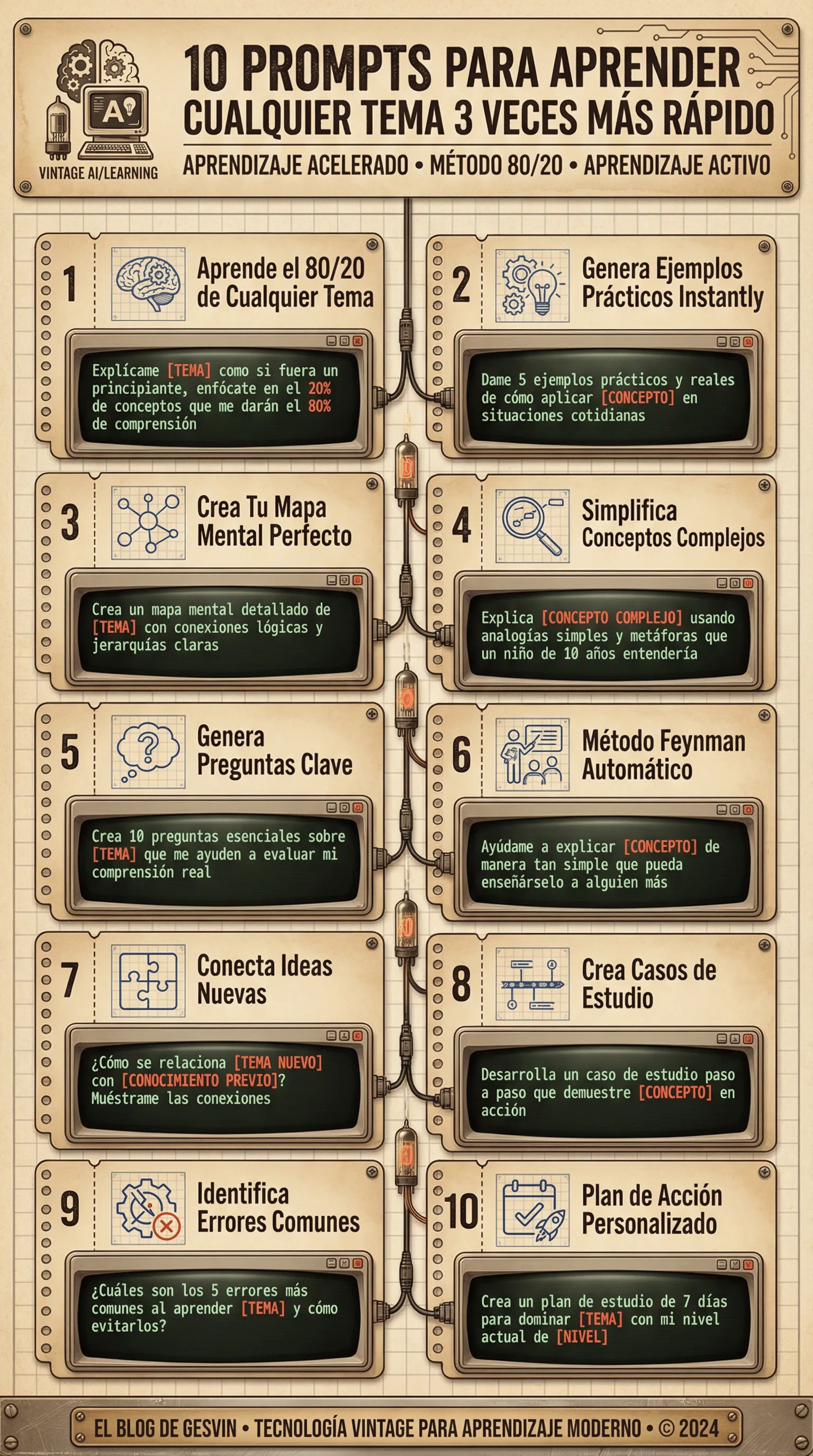 Los 10 prompts incluyen: explicación del 80/20 de cualquier tema, generación de ejemplos prácticos instantáneos, creación de mapas mentales perfectos, simplificación de conceptos complejos mediante analogías, generación de preguntas clave, aplicación del método Feynman automático, conexión de ideas nuevas con conocimientos previos, desarrollo de casos de estudio, identificación de errores comunes y creación de planes de acción personalizados de 7 días. Esta guía visual combina elementos vintage con tecnología moderna, presentando cada prompt de forma estructurada para facilitar su implementación inmediata en cualquier proceso de aprendizaje.