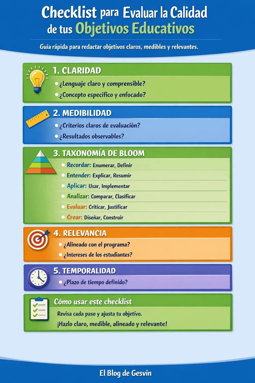 Este checklist presenta una guía sistemática y visualmente estructurada para evaluar y mejorar la calidad de los objetivos educativos. La infografía organiza cinco criterios fundamentales que todo docente debe considerar al redactar objetivos de aprendizaje: claridad (lenguaje comprensible y conceptos específicos), medibilidad (criterios de evaluación y resultados observables), taxonomía de Bloom (desde recordar hasta crear), relevancia (alineación con el programa e intereses estudiantiles) y temporalidad (plazos definidos).