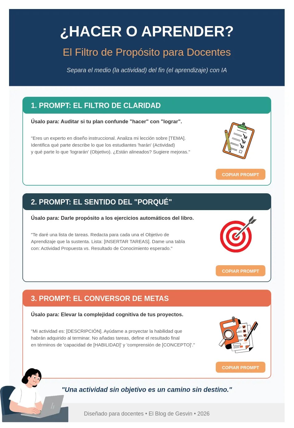 El primer prompt, ‘El Filtro de Claridad’, audita planes de lección identificando qué describen los estudiantes ‘harán’ versus qué ‘lograrán’. El segundo, ‘El Sentido del Porqué’, vincula cada actividad con objetivos de aprendizaje específicos mediante tablas comparativas. El tercero, ‘El Conversor de Metas’, eleva la complejidad cognitiva proyectando habilidades y capacidades en lugar de simplemente tareas. La premisa central, destacada al final, es contundente: ‘Una actividad sin objetivo es un camino sin destino’, enfatizando la necesidad de intencionalidad pedagógica en cada diseño instruccional.