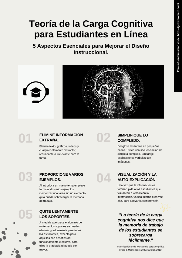 Teoría de la Carga Cognitiva para Estudiantes en Línea – 5 Aspectos Esenciales para Mejorar el Diseño Instruccional | Infografía