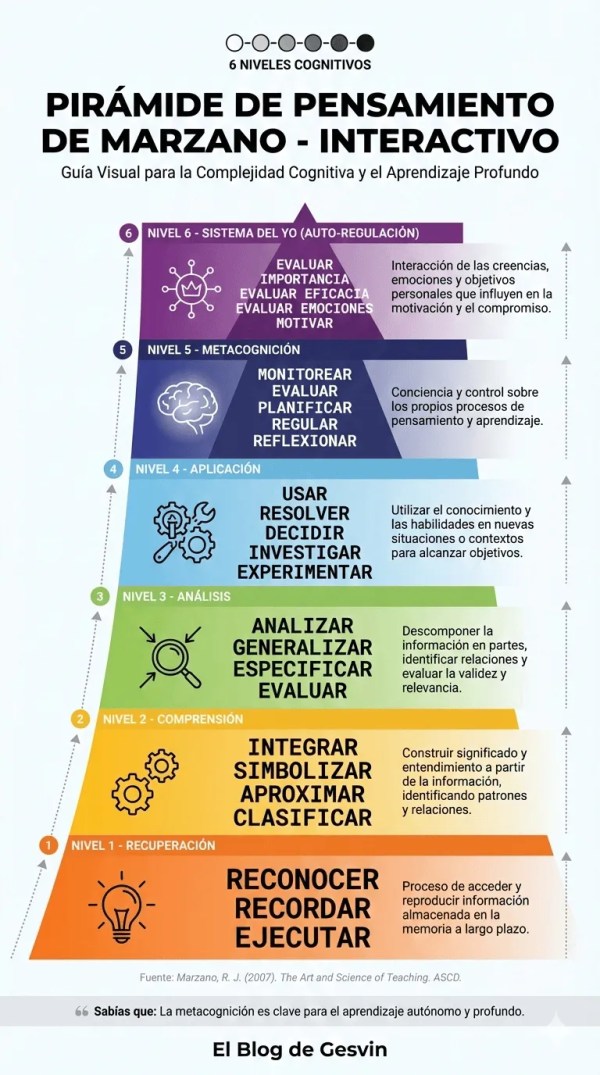 🎯 Descubre cómo la Pirámide de Marzano con sus 6 niveles cognitivos puede transformar tu práctica docente. Desde la recuperación básica hasta la autorregulación avanzada, esta guía visual te ayudará a diseñar experiencias de aprendizaje profundo y significativo.