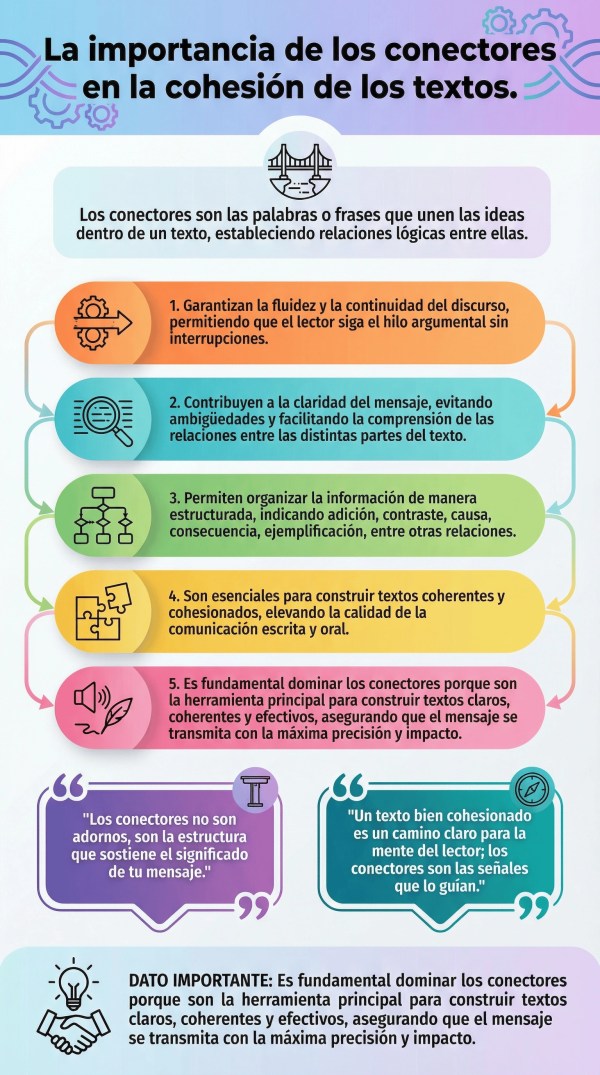 Descubre cómo los conectores transforman tus textos en obras maestras de claridad y fluidez. Aprende a tejer ideas con precisión, garantizando que tu mensaje resuene y sea comprendido sin esfuerzo. ”Domina el arte de la cohesión textual!