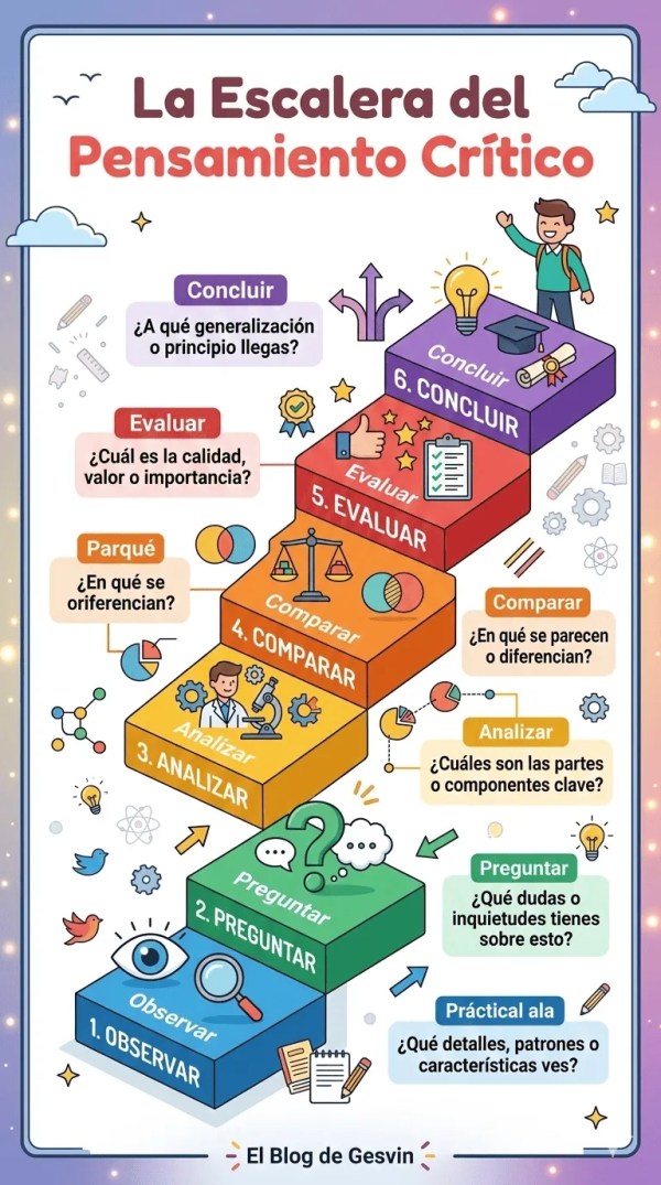 ๐ฏ Esta escalera de 6 niveles transforma el pensamiento superficial en anรกlisis profundo. Desde observar hasta concluir, cada peldaรฑo desarrolla habilidades crรญticas esenciales. Herramienta visual perfecta para planificar, evaluar y enseรฑar a pensar. ๐ง โจ