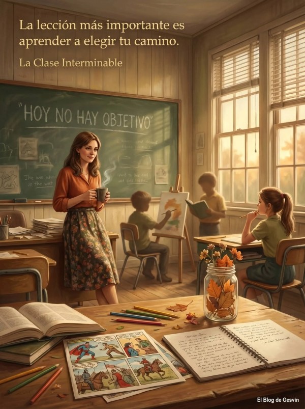 En un aula sin reglas, una profesora reta a sus alumnos: "Hoy no hay objetivo" 🧩. Entre cómics, poemas y frascos llenos de "esencia de aprendizaje" 🌿, descubren que la verdadera lección es elegir su propio camino ✨. Una historia sobre libertad, propósito y el arte de enseñar.