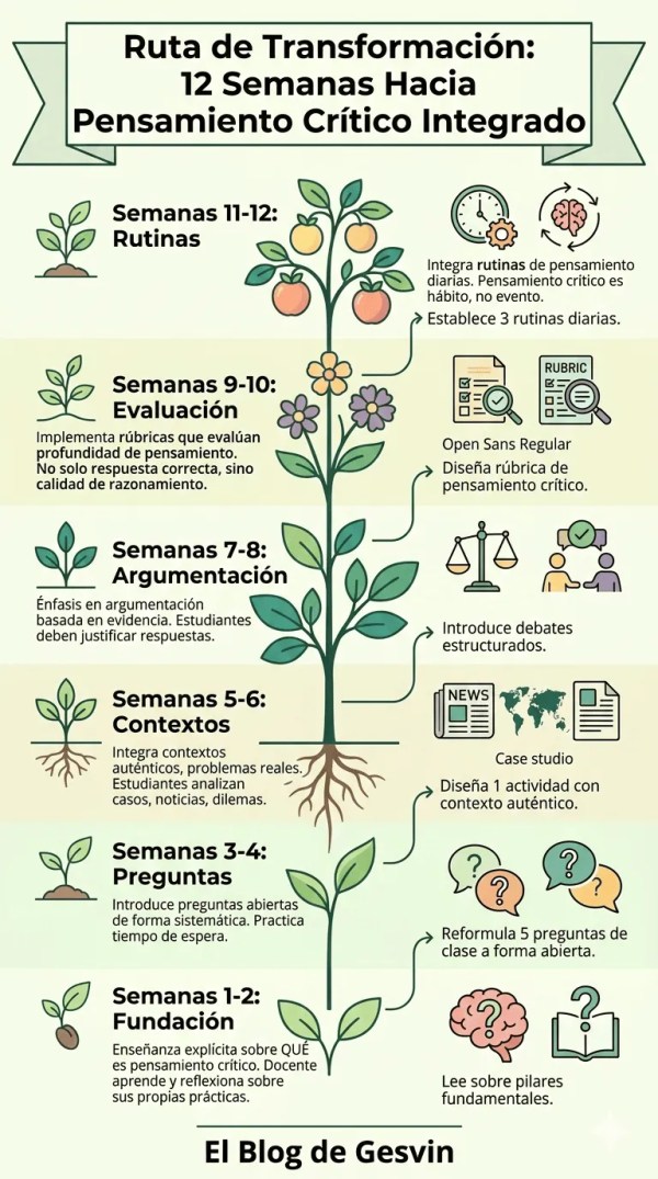 🌱 ¿Necesitas transformar tu aula en 12 semanas con una ruta progresiva que convierte el pensamiento crítico en hábito diario.? Metodología estructurada desde fundamentos hasta rutinas integradas. ¡El cambio sistemático que tu práctica docente necesita! 🧠✨